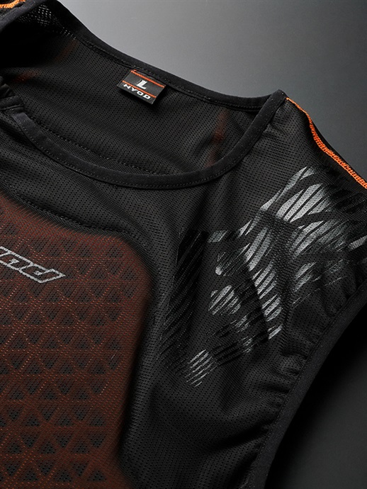 チェスト部分のプロテクターは通気性のよい形状のものを採用。ベスト本体には、伸縮性が高くフィット感と通気性に優れたメッシュ素材を採用。