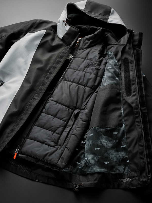 保温性の高い着脱式インナーキルトジャケットを採用した、新コンセプトのテキスタイルジャケット。