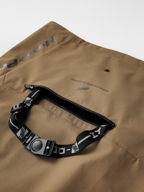 腰にあるポケットに本体を折り畳んで収納することができるパッカブル機能を備えています。ベルトも備えたバッグ状になりますので携帯に便利です。アウターシェル着用時にはポケットとしてインナーなどの収納に活用していただけます。