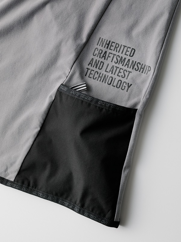 本体は右腰にあるポケットに本体を折り畳んで収納できるパッカブルです。着用時には二つ折りの財布が入るほどの大きさのポケットとしてご利用いただけます。