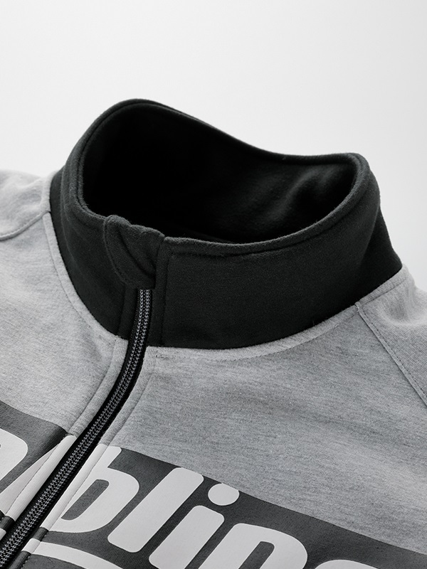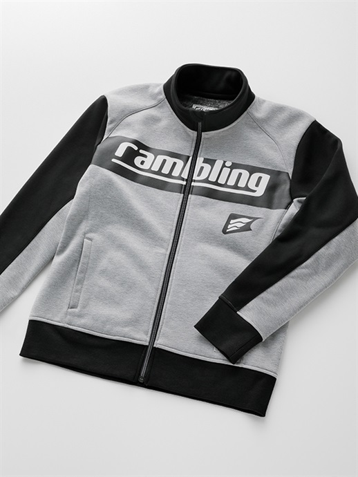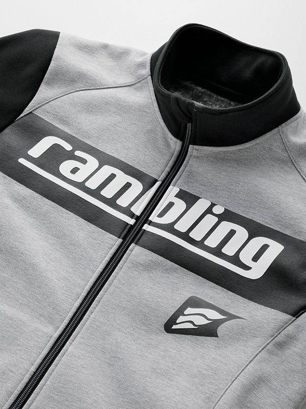 胸に大きく“rambling”をプリントしたスタンドカラーのウインドブロックジャケットです。肌触りが柔らかいスウェット生地に防風フィルムをボンディングしていますので、アウタージャケットのインナーとして活用していただくほか、日常着としてもご利用いただけます。