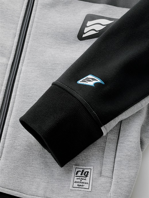 腹部に左右からアクセスでき、小物入れのポケットとしても使えるハンドウォーマーを備えています。裾はジャケットのインナーとして着用することも考慮した裾丈とし、伸縮性のあるリブニットでフィット感を高めています。