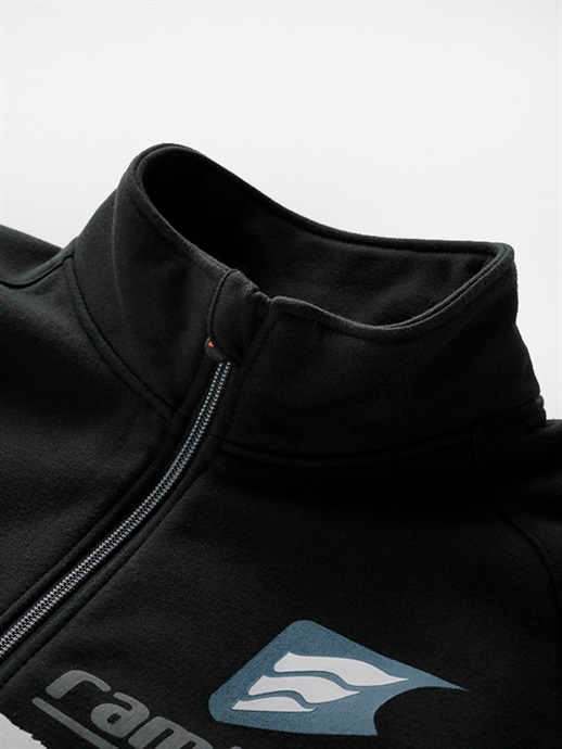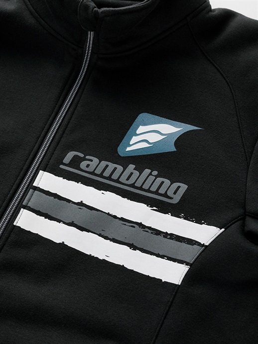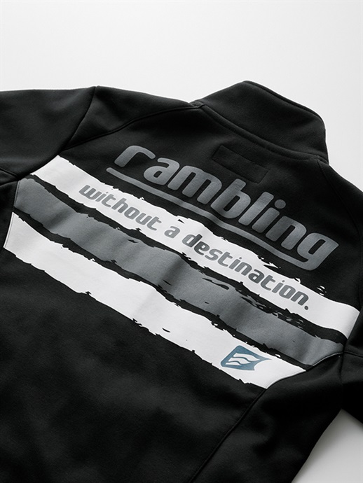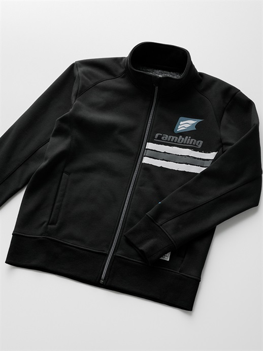 左胸に“rambling”をプリントしたスタンドカラーのウインドブロックジャケットです。肌触りが柔らかいスウェット生地に防風フィルムをボンディングしていますので、アウタージャケットのインナーとして活用していただくほか、日常着としてもご利用いただけます。