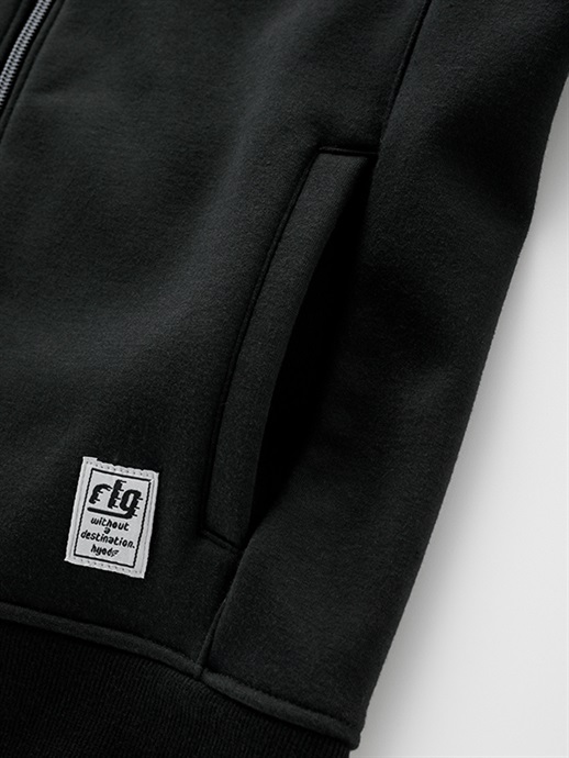 腹部に左右からアクセスでき、小物入れのポケットとしても使えるハンドウォーマーを備えています。裾はジャケットのインナーとして着用することも考慮した裾丈とし、伸縮性のあるリブニットでフィット感を高めています。