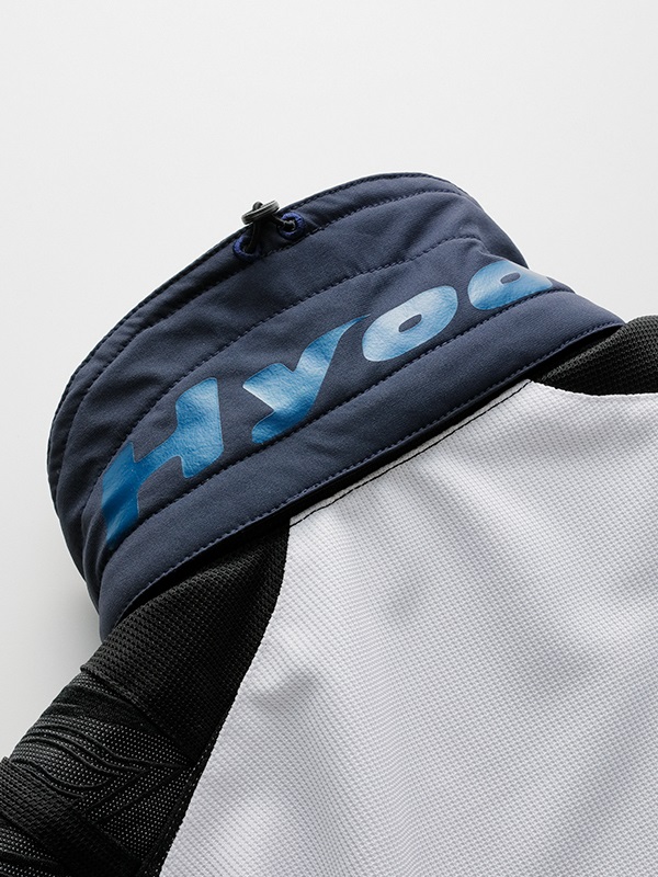 マテリアルには、適度なハリを持ちながら軽量でソフト、かつ強度にも優れたテキスタイルメッシュを使用。走行風を効率よく取り込み、裏地には吸汗速乾性に優れたHYODロゴ入りエアーメッシュを採用することで、汗をかいてもベタつきにくいコンディションを保ちます。袖口にはEVOKEシリーズのインサレーションウエアと連結できるスナップボタンを備え、気温の変化にも柔軟に対応。