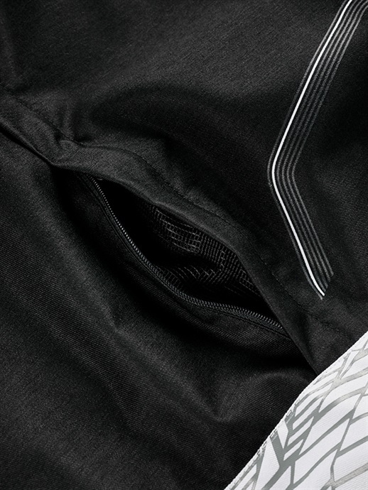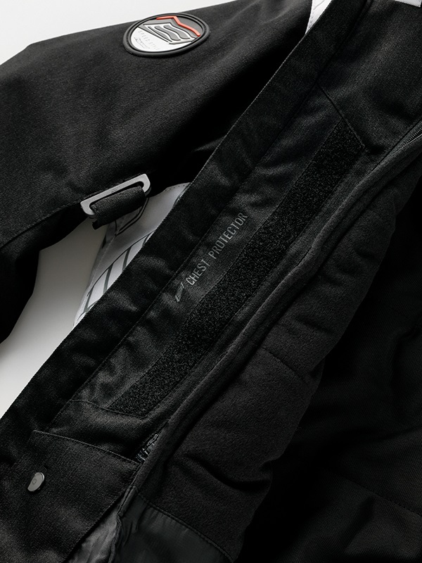ジャケットの内側にHYOD D3O®チェストプロテクターを装着するアタッチメント(面ファスナー)を装備しています。ワンピースタイプのチェストプロテクターは2カ所で、ツーピースモデルは左右それぞれ1カ所で固定することができます。