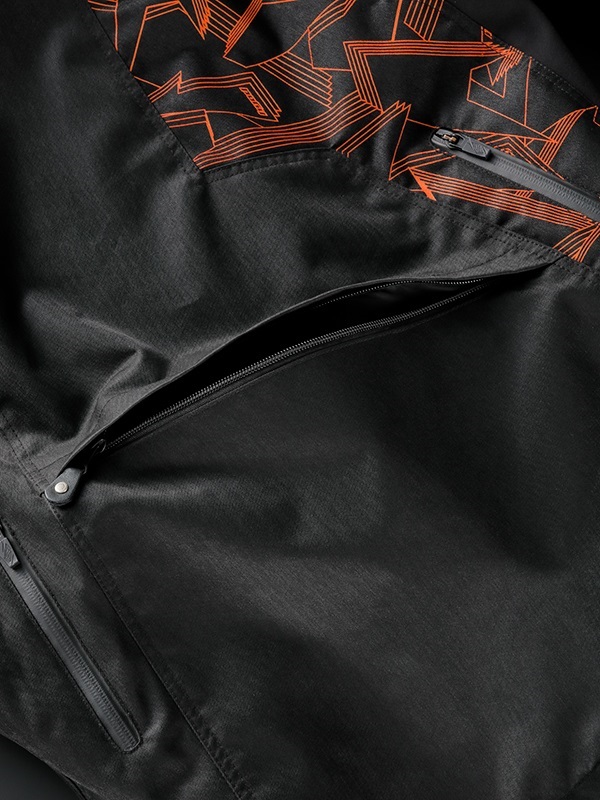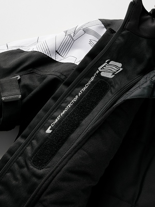 ジャケットの内側にHYOD D3O®チェストプロテクターを装着するアタッチメント(面ファスナー)を装備しています。ワンピースタイプのチェストプロテクターは2カ所で、ツーピースモデルは左右それぞれ1カ所で固定することができます。