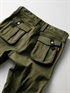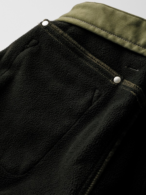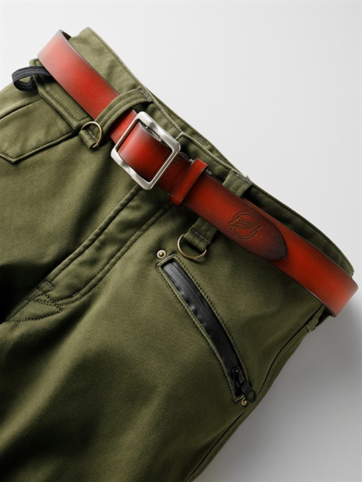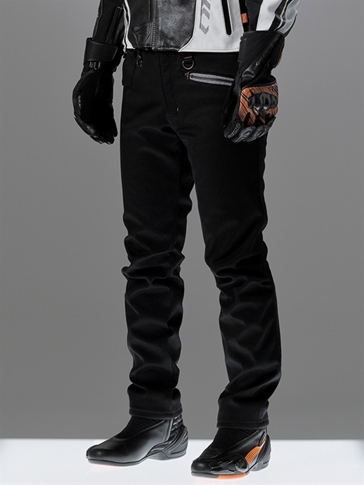 肌触りにすぐれたストレッチ生地を使っています。シルエットは、膝から裾にかけて細くなっていくテーパードスタイルです。左腰前側のジッパーポケットには、貴重品などかさばらないものを収納することができます。車両の取り回しによるタンクへの傷つけ防止のため、ジッパーポケットは、左側のみ取り付けています。