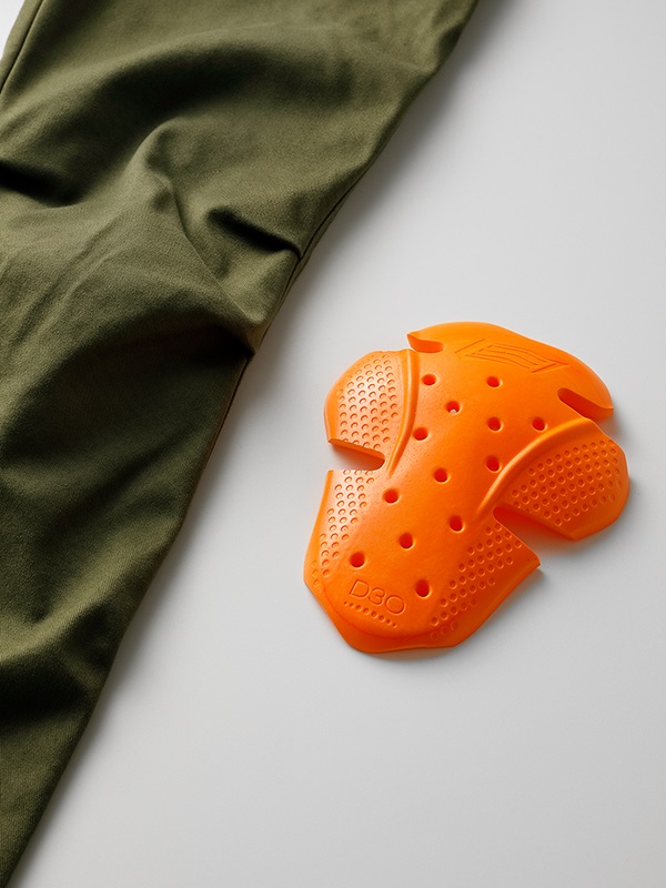 膝には衝撃吸収力と装着感に優れたD3O®プロテクターを標準装備しています(着脱可能)。体型に合わせて上下2段階の位置調節ができます。プロテクションがソフトでフレキシブルなため、着け心地やデザイン、シルエットなど多くのメリットを生み出しています。