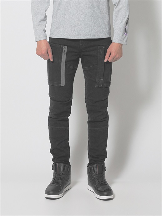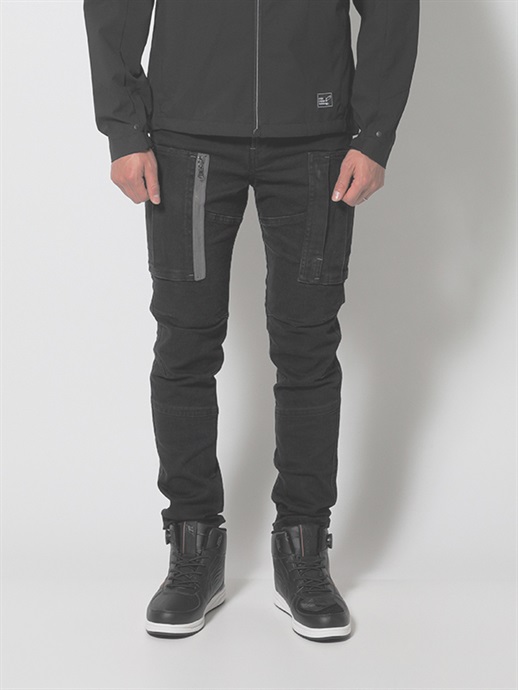 デザイン性と利便性に優れたカーゴポケットを両足に取り付けています。従来のカーゴパンツとは違う、左右で形状が異なるアシンメトリーのデザインです。どちらのポケットもファスナーで開閉するポケットに仕上げています。