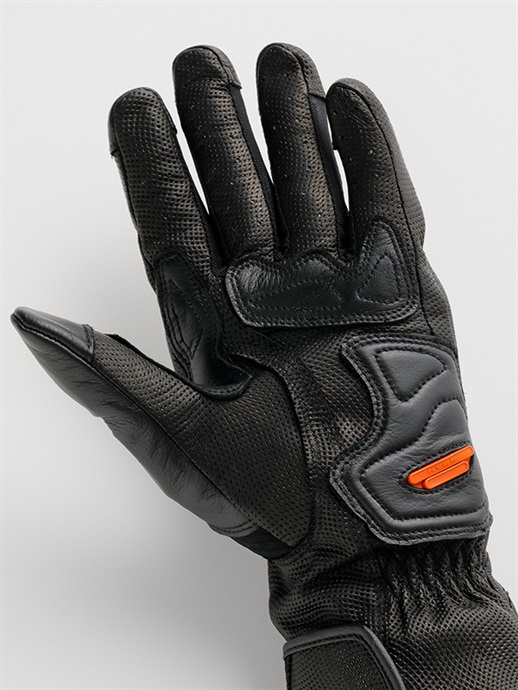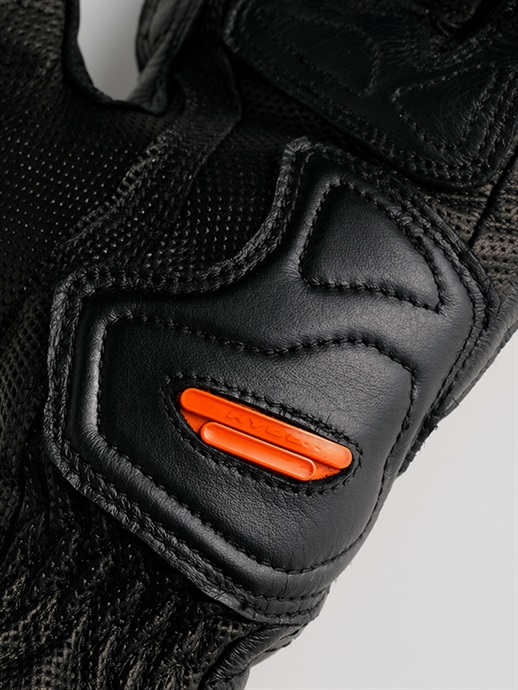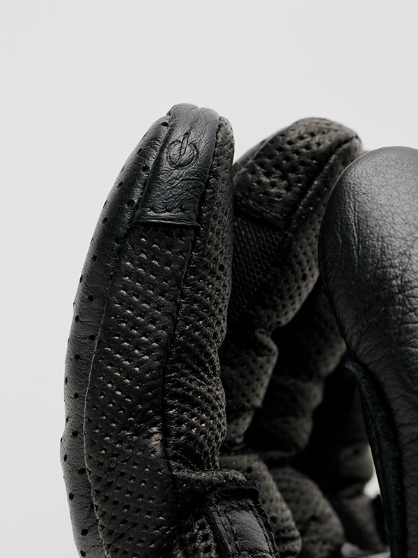 手の甲側には、強度と耐久性にすぐれたパンチング加工を施したカウレザー(牛革)を採用しています。また、転倒時のダメージが小さい箇所にはストレッチ性のあるテキスタイル生地を部分使いして、快適さと操作性を向上させています。