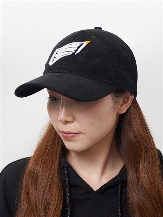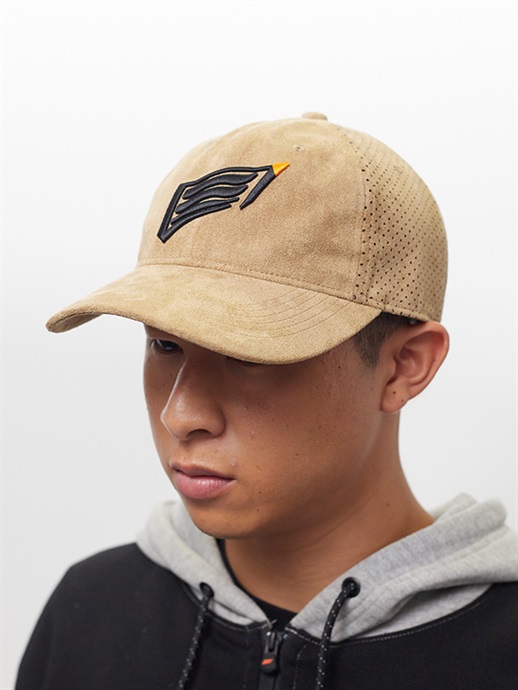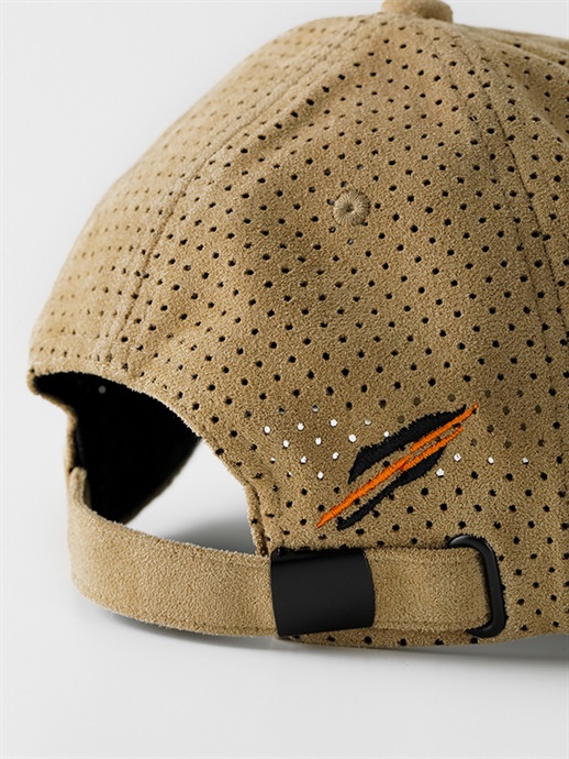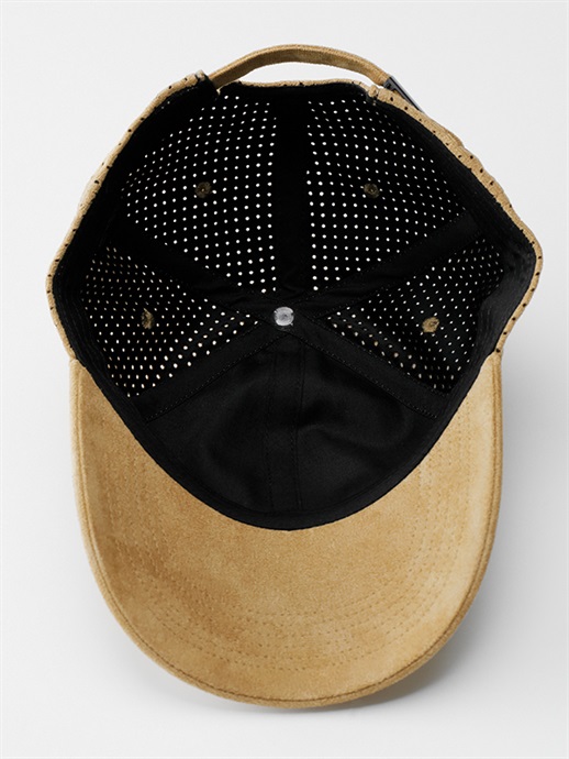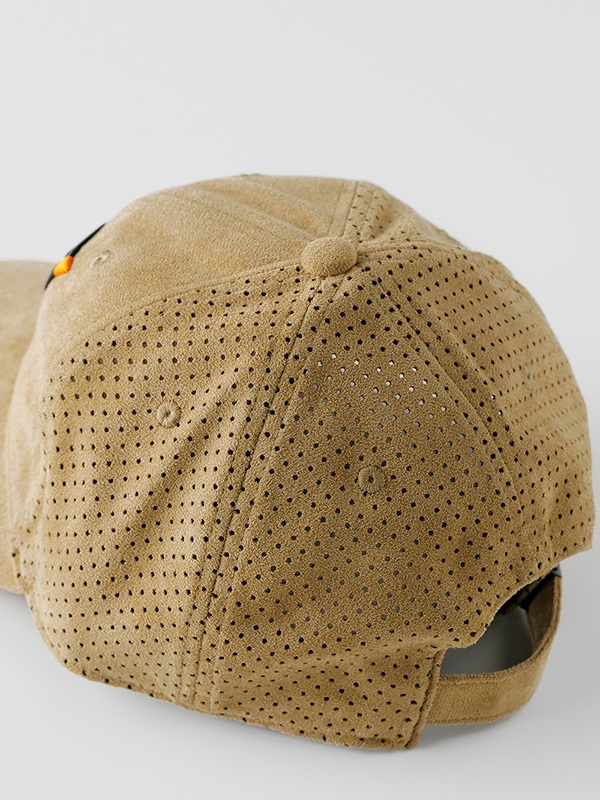 フロントパネルとバイザーはスエード調仕上げ、フロントパネル以外の部分は、パンチング加工を施したスエード調の落ち着いた雰囲気のある仕上りです。素材はポリエステル100%です。