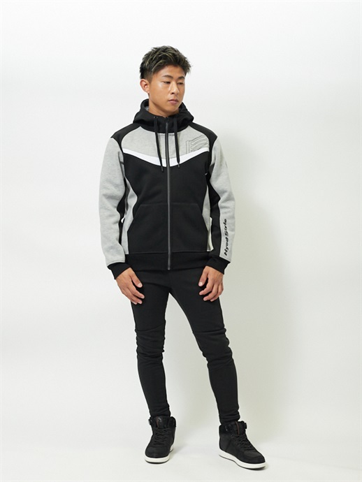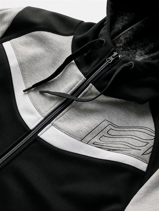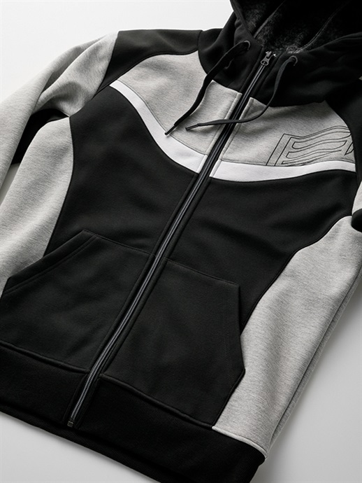 切り替えによるデザインが新鮮なジップパーカです。プリント手法とは趣きが異なる高級感と存在感のある仕上りです。