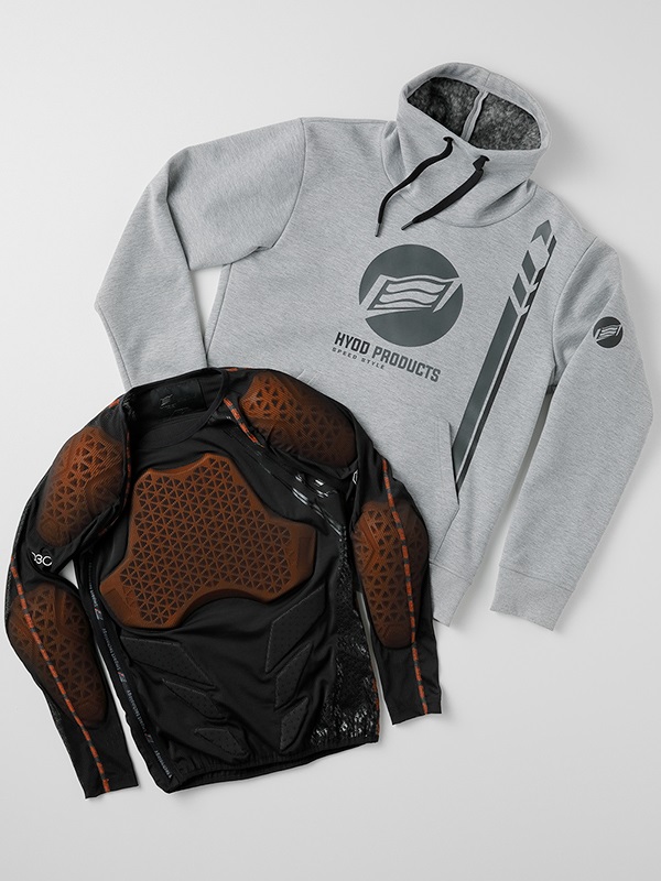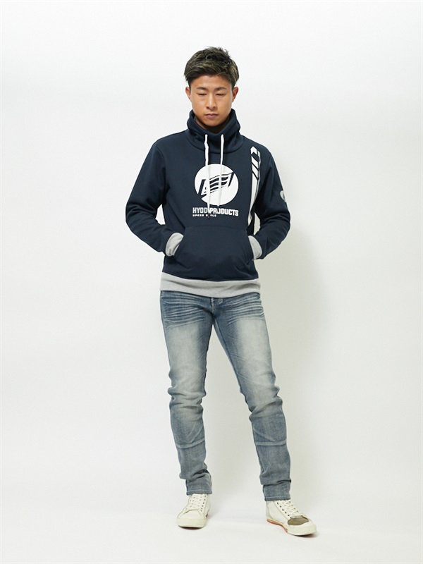 胸に大きなクレストマークとHYOD PRODUCTSロゴ、左の肩口から裾にかけてストロボデザインのグラフィックを配した、躍動感と華やかさ溢れるデザインに仕上げています。