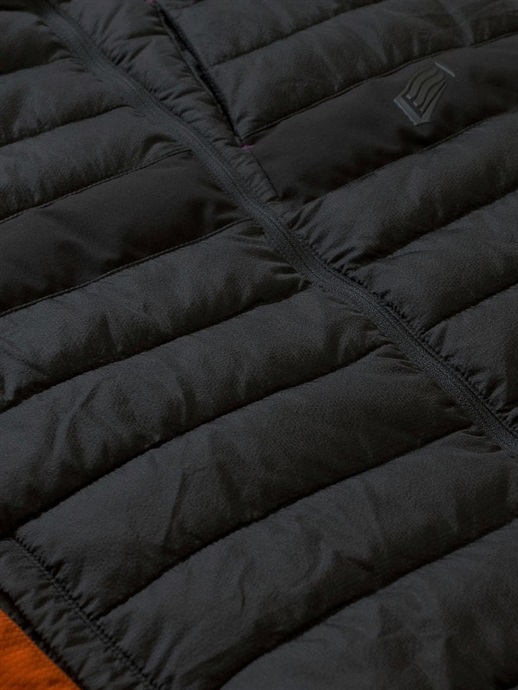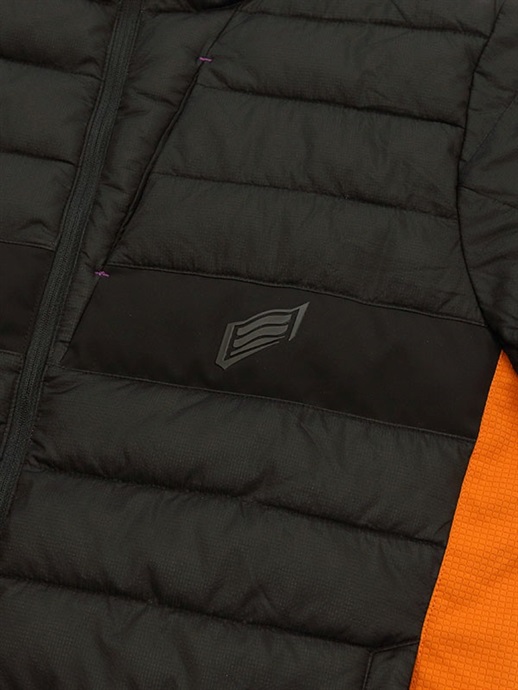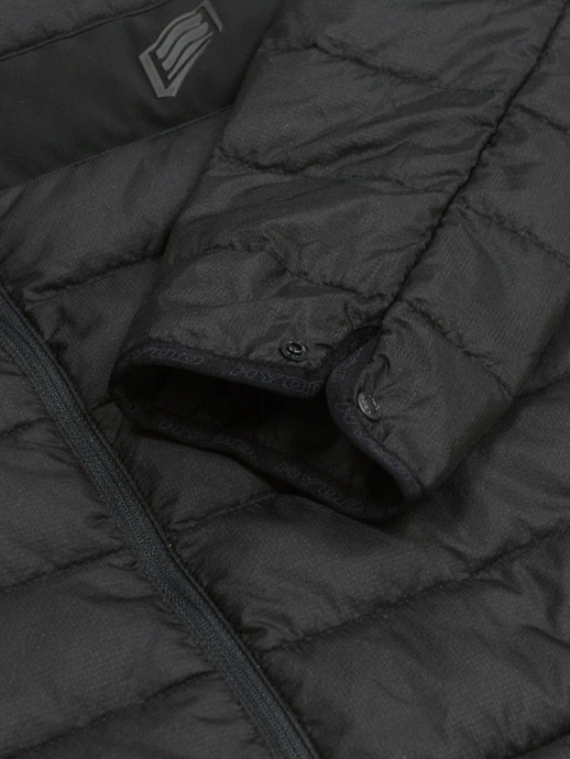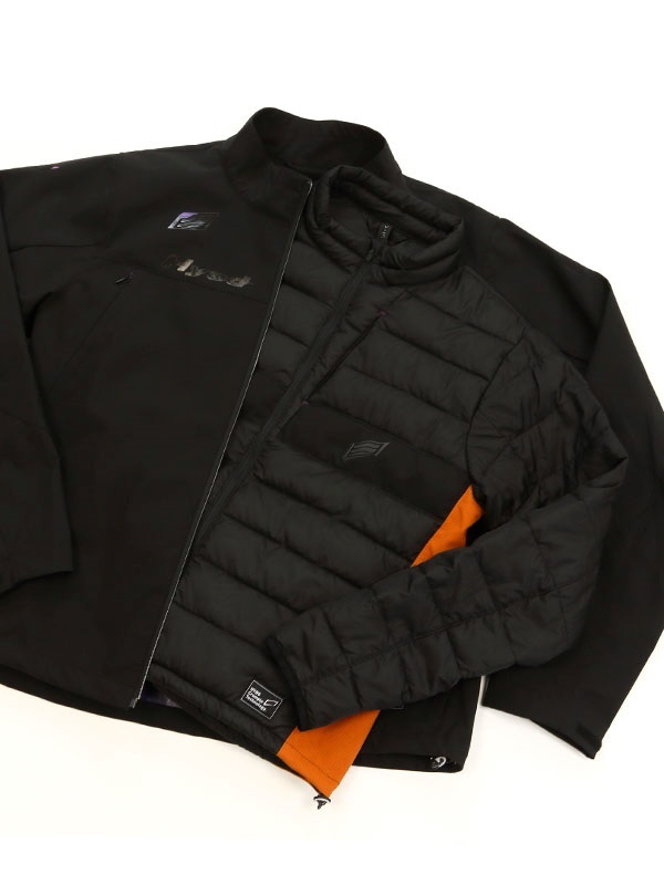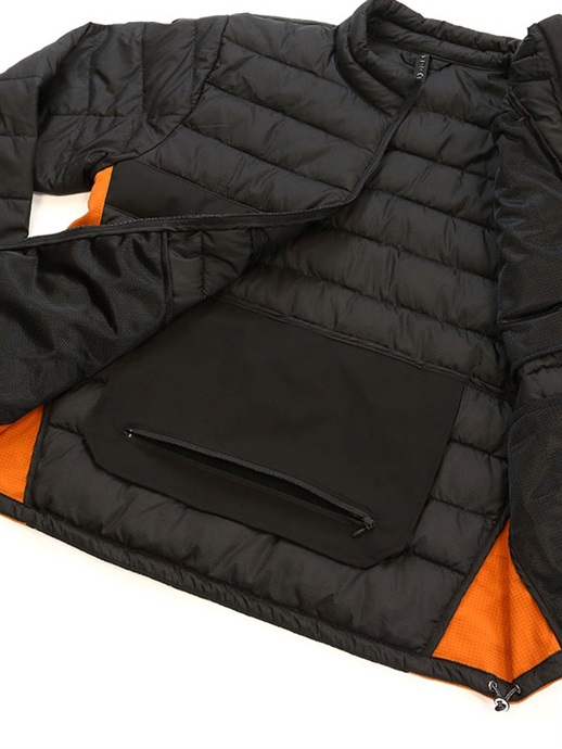 EVOKEのアウターシェルはインサレーションウエアとの重ね着がおすすめです。インサレーションウエアはアウターシェルとの重ね着を前提としたパターンを採用していますので、かさばらず着心地も軽やか。中綿入りのものから適度な通気性のあるものなどをラインアップし、使用状況に合わせてお選びいただけます。アウターシェルとの連結はネック部分のループと、袖先にあるプラホックでできるようになっています。