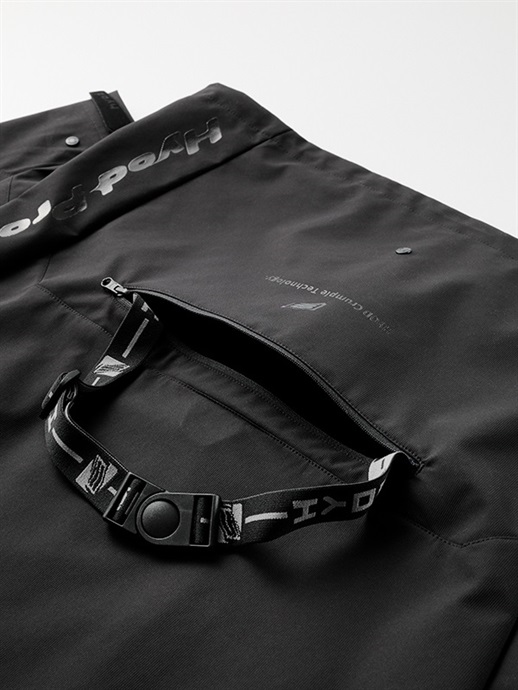EVOKEは本体背面の腰に備わるポケットに、本体を畳んで収納することができるパッカブルです。収納時は横30cm×縦20cm×奥行8cmのバッグ状になりますので、ツーリング先でアウターシェルを脱いで持ち運ぶことも可能です。