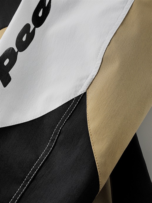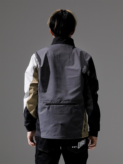 ひときわ目を引く表生地にはリサイクル原料を使用したコットンライクな素材に撥水加工を施し、裏地との間に耐水・透湿素材をボンディングした3レイヤー生地を採用。裏地は肌触りがよく、ストレッチ性もあるトリコット生地を採用することで、快適な着心地を実現しています。