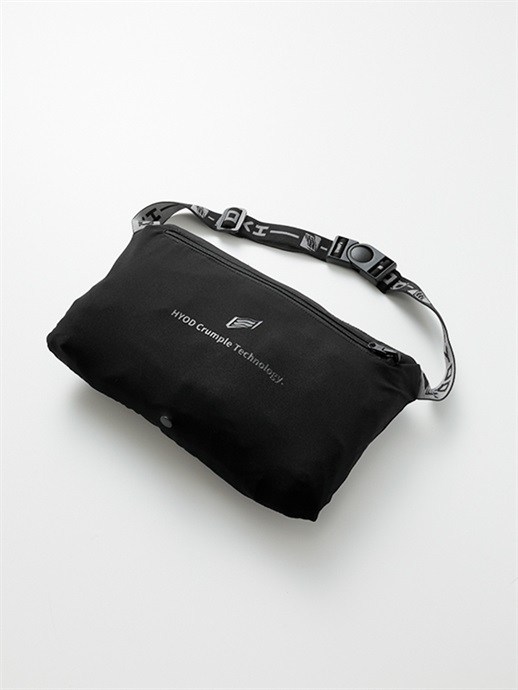 腰にあるポケットに本体を折り畳んで収納することができるパッカブル機能を備えています。ベルトも備えたバッグ状になりますので携帯に便利です。アウターシェル着用時にはポケットとしてインナーなどの収納に活用していただけます。