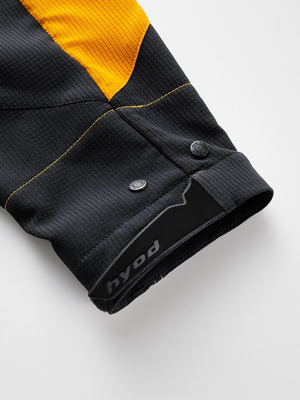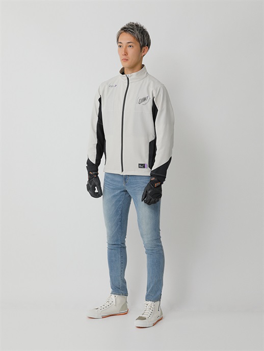 パターンには、ライディングとストリートの最適なバランスを追求したHYOD EVOKEパターンを採用。ほどよいシルエットを基調に、ライディング時の姿勢や身体の動きに無理なく追従する設計とすることで、走行中も街中でも違和感のない着用感に仕上げています。スタンドネックは首元をすっきりと見せながら、走行時の収まりにも配慮したデザインです。