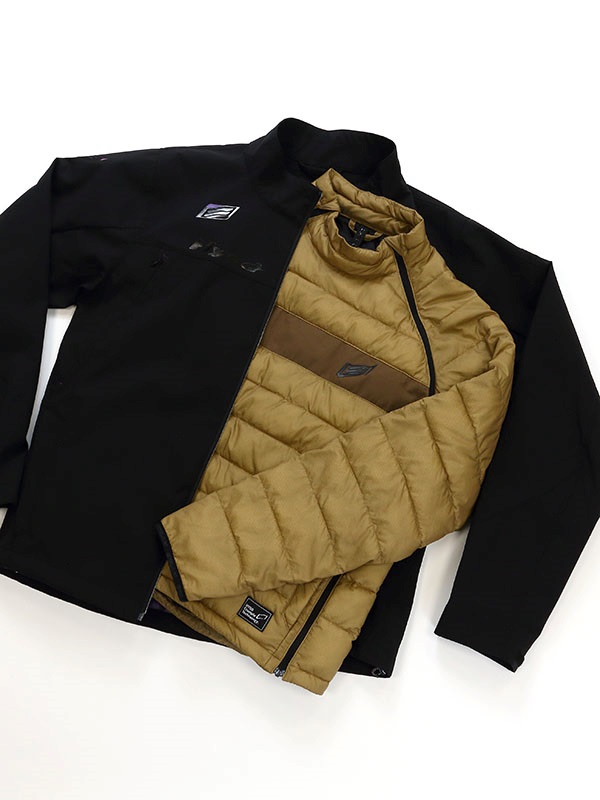 EVOKEインサレーションウエアは単体でも着用いただけますが、EVOKEアウターシェルとの組み合わせがより効果的です。アウターシェルとは袖口やネック部分にあるプラホックで連結することができますので、一体感のある着用感を得ることができます。また、アウターシェル側にプロテクターを装着することができますので、安全性も高まります。EVOKEアウターシェルは表地と裏地の間に耐水・透湿素材をボンディングした3レイヤー生地を採用することで、簡易防水性を備えていま。インサレーションウエアとの組み合わせで幅広い気温に対応することが可能となります。