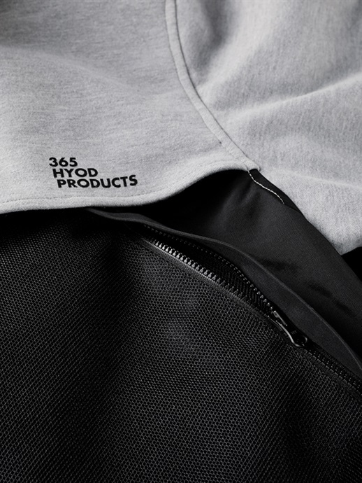 こちらも一見フツーに見えるけどHYODのエッセンスが感じられる一着に仕上げています。このモデルは、テキスタイルとメッシュをクロスオーバーしたサマーライディングに最適な素材使いとなっていて、サマーシーズンでもとても軽く快適に着用いただけるジャケットです。”gano”と同様にライディングはもちろん、いつでも着られる高い汎用性を持つウエアに仕上げていて、まさに365が意味する“バイクのある日常”を表現した一着となっています。このモデルもHYOD365の定番となっているロングセラーモデルで、ショートバイザー付きのフードは襟まわりに収納することもでき、シーンにあわせた着こなしを楽しむことができます。フロント下部と背中部分の素材を大胆にメッシュ生地で切り替えているのでエアーの導入効果を存分に体感いただけます。裏地の素材も吸汗速乾に優れたメッシュ生地を採用しているのでとても快適です。緩やかにオフセットしたフロントファスナーは、着用時の首やアゴとの干渉を防ぎストレスレスな着用感にも気を配りました。ベースパターンは、ストリートシーンでのシルエットを強く意識した「HYOD365パターン」を採用し、前幅、背幅、腕部等の細かなサイズの調整を行うことで、ストリートだけでなくライディングにも対応する美しいシルエットを誇ります。