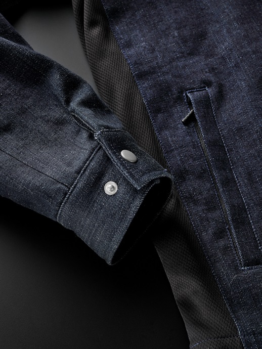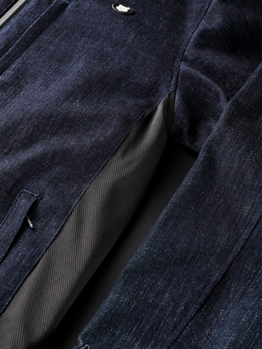 こちらも一見フツーに見えるけどHYODのエッセンスが感じられる一着に仕上げています。このモデルは、ドライなタッチで清涼感のあるサッカー生地をメインマテリアルに使用しました。素材自体がとても軽く、ドライなのでサマーライディングにとても最適です。