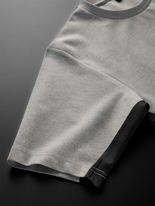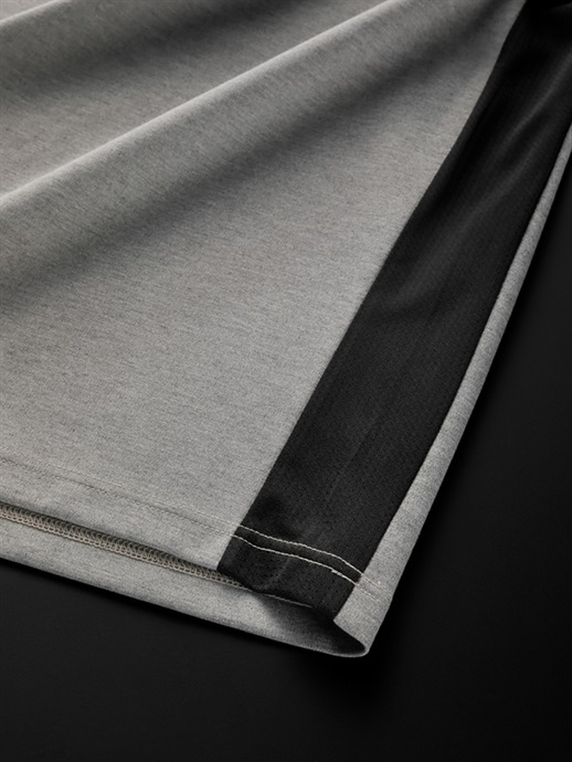 風合いがよく、なめらかでやわらかいレーヨン混のコットン生地を使用しています。厚手で型崩れがしにくく、ほどよいコシがある素材です。また、ムレ感を軽減する吸湿性の高さもこの生地の特徴です(綿60%・レーヨン35%・ポリウレタン5%)。脇部分は通気性のよいメッシュ素材で切り替えています。