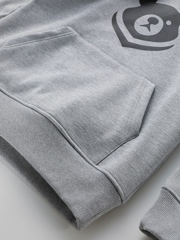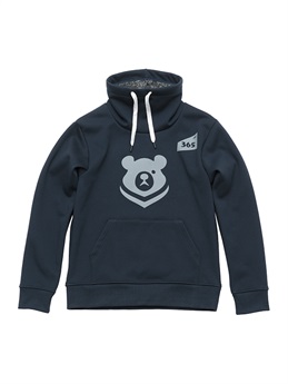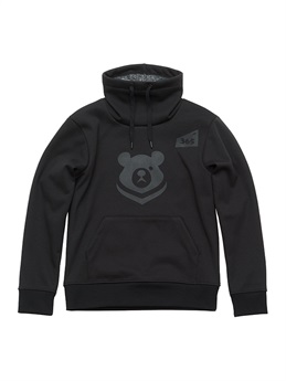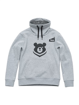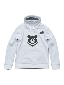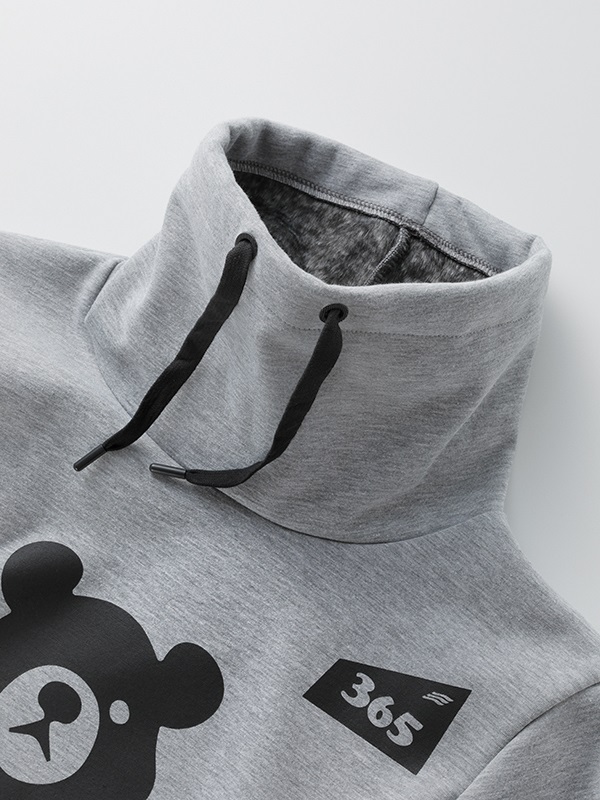 季節限定生産 ウインターアパレル用に開発された防風性と防寒性に優れた3層構造の防風素材を使ったハイネックスタイルのウインドブロックヒートアパレル。スウェット素材に防風フィルムをボンディング、さらに柔らかさと肌触りにすぐれたシャギー素材を裏側に使って、抜群の保温性能を発揮しています。首まわりをすっぽりと覆うことのできるモックネック仕様。首まわりのドローコードをネック内側のホールから引き出して着るなど、シーンや好みに応じて使い分けができます。胸に大きく“365ベアー”のプリント入り。
