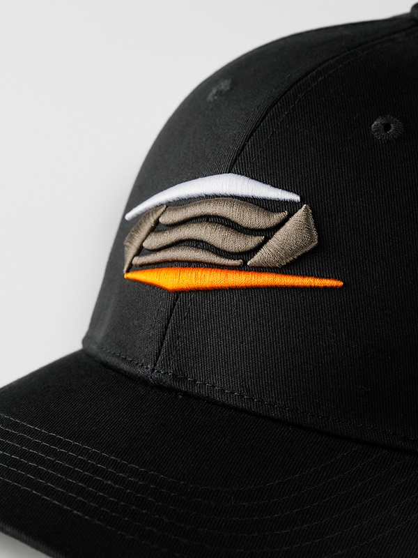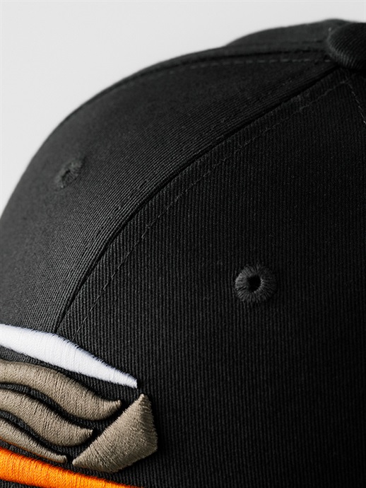 フロントパネルに、デザインアレンジした “クレストマーク”の3D刺繍を施しています。3色を組み合わせた立体的な仕上りが特徴です。後ろ側にはスクエアにレイアウトした“HYOD”の刺繍入りです。