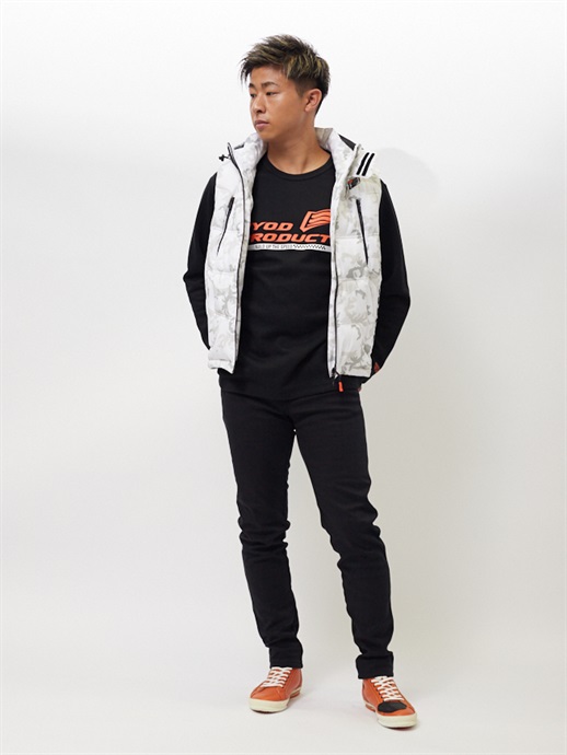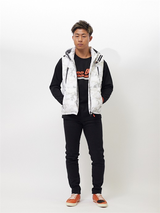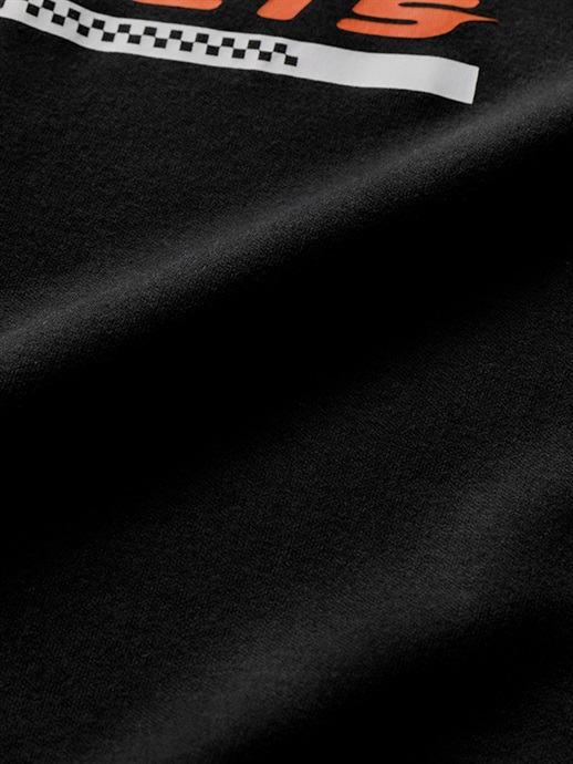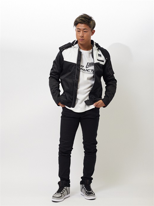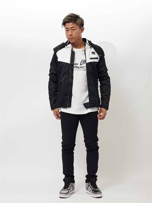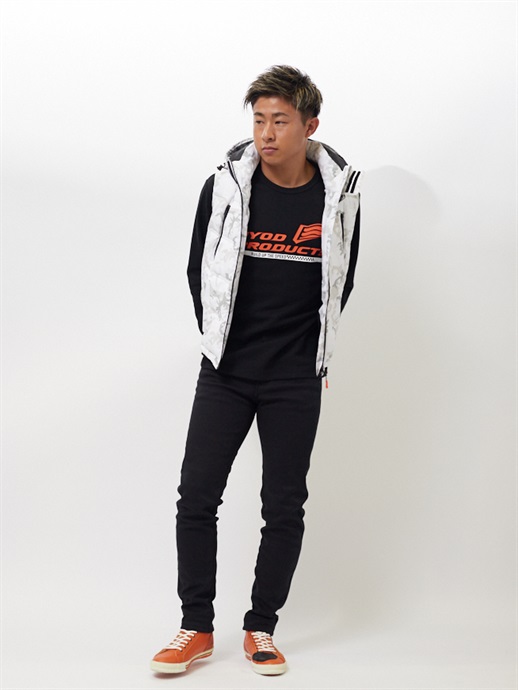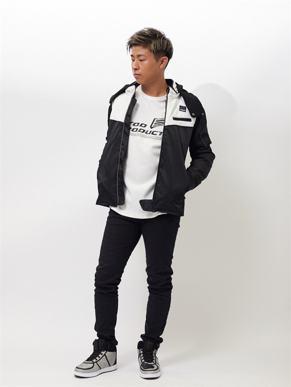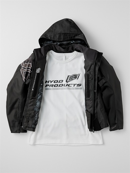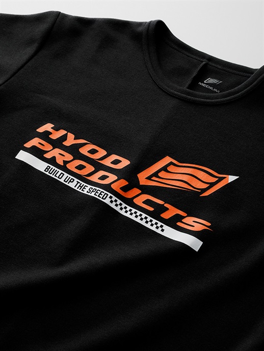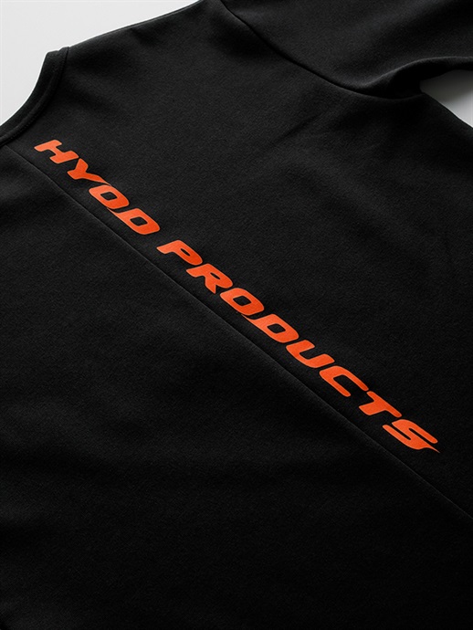 胸部分に大胆に“HYOD PRODUCTS”とクレストマークをレイアウトしたデザインです。左袖には“BUILD UP THE SPEED”とクレストマークのプリントを配しています。バックスタイルでは、縦の切り替えラインに沿って “HYOD PRODUCTS”のプリントを施しています。