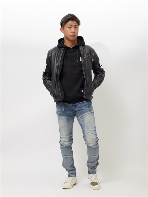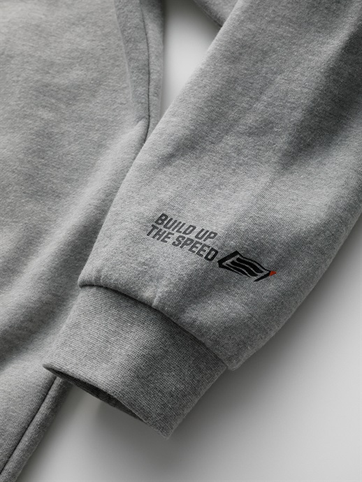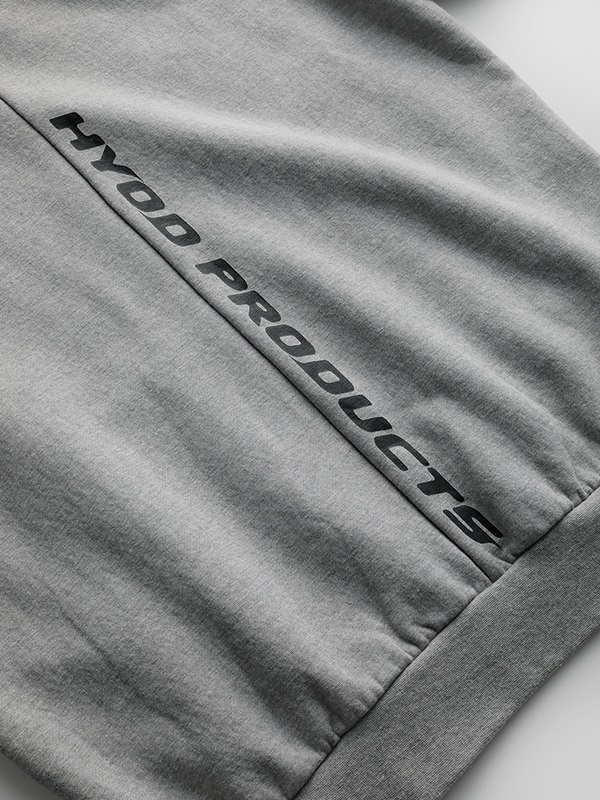 胸にワンポイントでクレストマークをプリントしたシンプルなデザインです。左袖には“BUILD UP THE SPEED”とクレストマークをワンポイントでプリント。左裾には織マーク付きです。背中の縦の切り替えラインに沿って “HYOD PRODUCTS”のプリントを施しています。