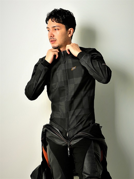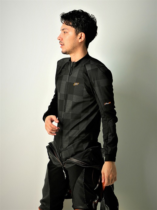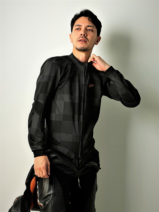 ウインターシーズンのレザースーツ用インナーとして開発されたワンピースタイプのミドルレイヤー。ツーピースを上回る保温性とフィット感はストリートライディングでも真価を発揮。3D立体パターンや袖の動きを考慮したラグランパターン、サポート機能を備えたワンウェイストレッチ素材の採用など、レザースーツのノウハウを随所にフィードバックしています。スポーツライディングはもちろん、ロングツーリングのミドルレイヤーとして着用が可能。モデル:身長180cm B83.5 W71 H89 / 着用サイズ:L