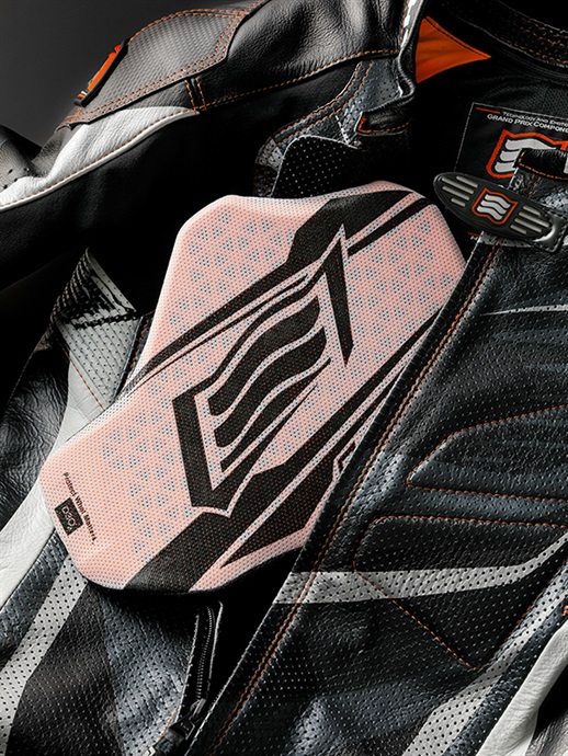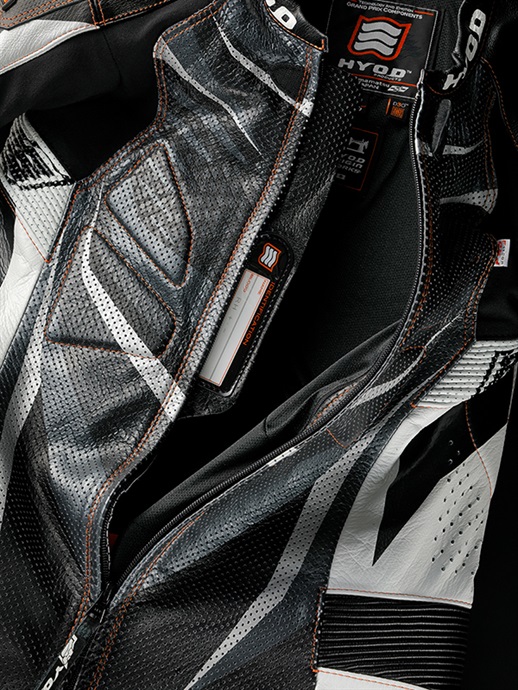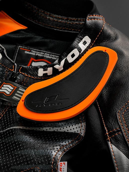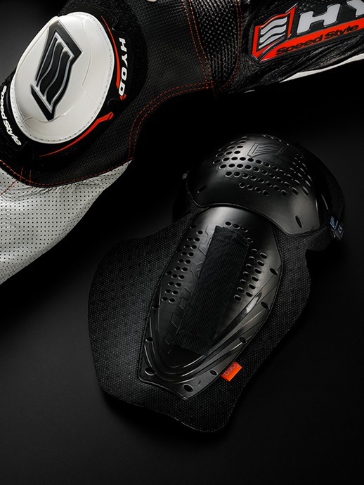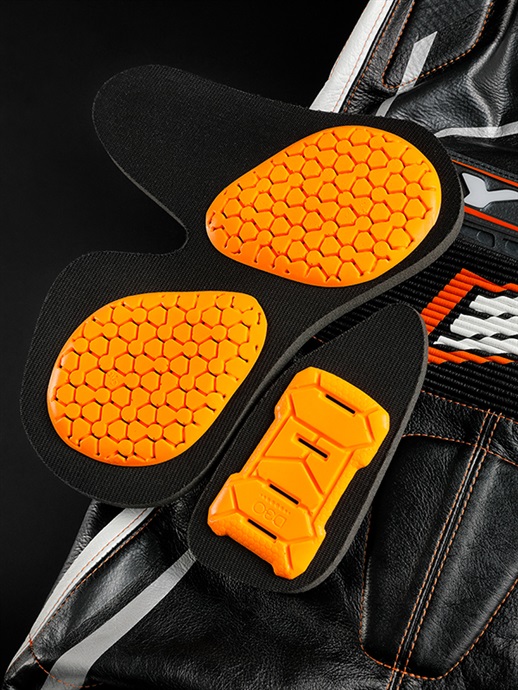 肩・肘・膝のプロテクターには、HYODレーシングスーツ専用に設計、開発された完全なるオリジナルプロテクターを装備。レーシングスーツの形状に合わせて専用設計され、ストレスフリーな着用感と高い衝撃吸収性能を併せ持ちます。基本構造はメッシュ生地がボンディングされたウレタンスポンジとハードシェル、D3Oのパッケージで構成されており、軽く、着用感に優れたプロテクターとなっています。もちろんヨーロッパの安全規格CEレベル1もクリアしています。