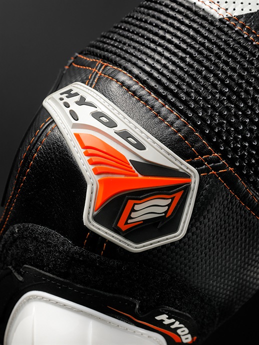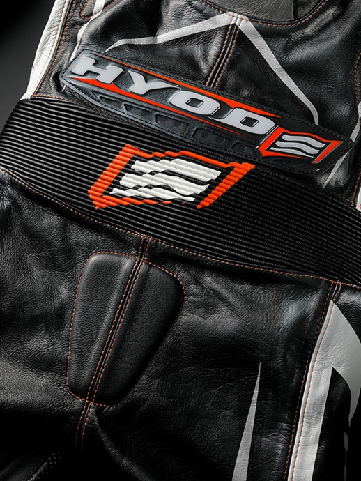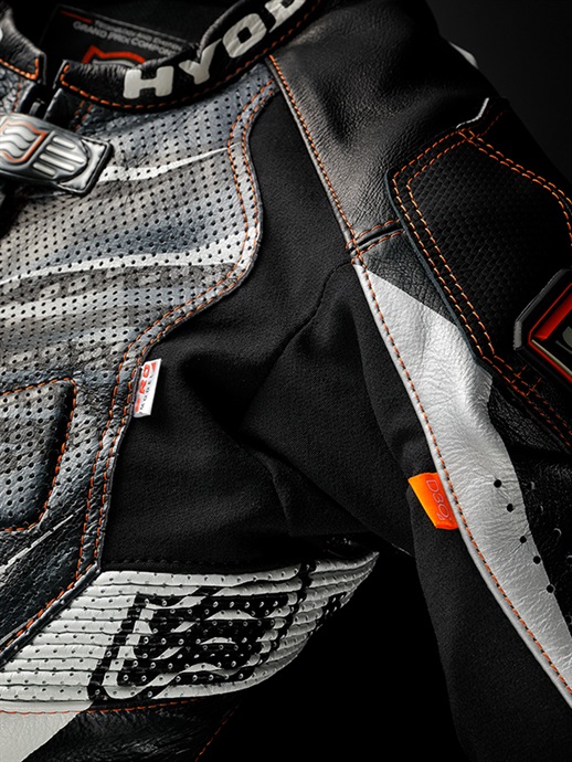 各部に装備されたHYODワッペンには、転倒時のレーシングスーツ本体の損傷を軽減する役目も兼ね備えています。 腰にはワッペンと一体化されたエアダクトを配置することで、レーシングスーツ内のムレを軽減。走行時の快適性を高めます。