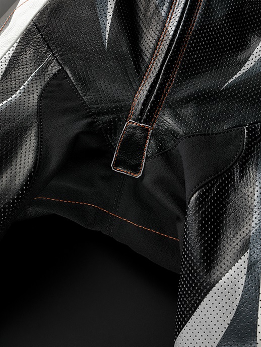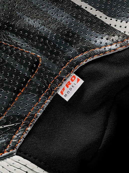 フロントファスナー内側にはショートタイプのファスナーカバーを採用。前傾姿勢の際の前身レザーのゴロつきを軽減し、フレッシュエアーの導入を促進する、プロライダーが好むスペックを標準装備しています。
