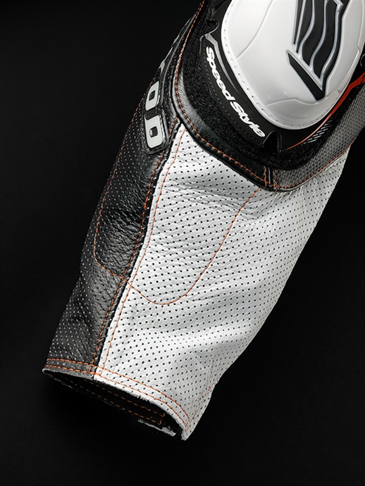 転倒した際にダメージを受けやすい肩とヒザには、引っかかりが少なく損傷を最小限に抑えることができるディバイドショルダーパッチとディバイドニーパッチを装備。立体を構成する為の縫製には引っかかりの少ない縫い開きの手法をとり、部分的にエンボス加工で強度を上げた型押しレザーを採用しています。