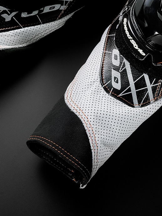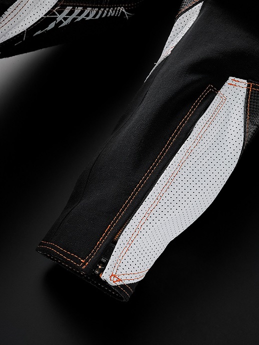レザーには直径1mmのマシンパンチングメッシュを採用し、さらに肩にはエアインテークを、腰にはワッペンと一体化されたエアダクトを配置することで、快適性を高めています。