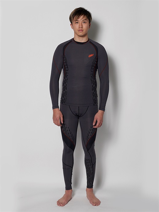身体の動きに追従し、フィット感が適正な着圧を生み、ライディングによる疲労蓄積を軽減させます。汗を吸い取り水分を蒸発させる特性は、メッシュジャケットとの併用によって水分が蒸発する際の気化熱作用が働くことで、体をクールダウンさせる効果もあります。