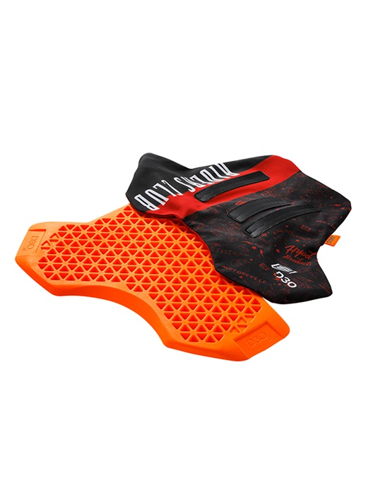 D3O® AIRチェストプロテクターをジャケットに装着するためのカバーには、スピード感あふれる昇華プリントを施しています。このカバーの素材にはクール素材の夏の定番アイテムでもある“気化熱”を活用したUCHIMIZU素材を採用していますので、ひんやりとした肌触りを体感いただけます。