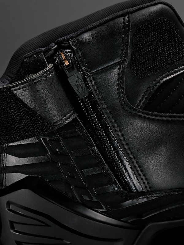 発汗による蒸れを軽減し、雨などの急な天候の変化にも対応できる防水・透湿仕様の全天候フットウエアです。また、水の侵入しやすい内側ファスナーの内側にフラップを設けて、防水性能を高めています。