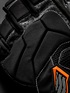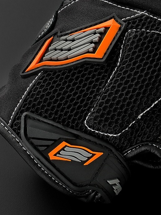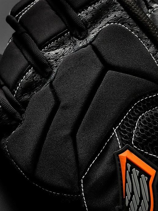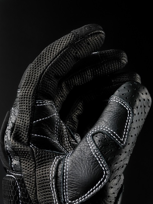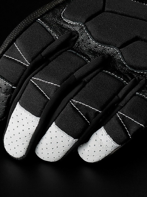 手の甲側には、強度と耐久性にすぐれたカウレザー(牛革)を採用しています。まだ転倒時のダメージが小さい個所にはストレッチ性のあるテキスタイル生地を部分使いして、快適さと操作性を向上させています。