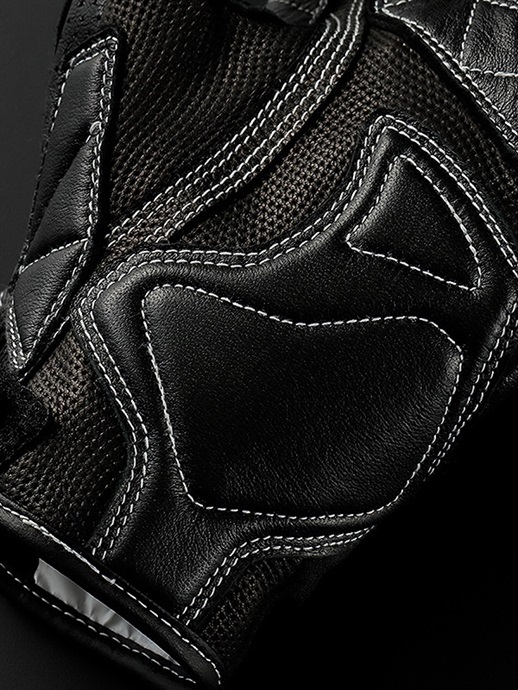 掌の素材にはゴートレザー(山羊)を採用しています。軽く丈夫で、タッチ感覚にすぐれ、エンボス加工による滑りにくくグリップ力を高めています。親指を除く指には、蒸れを軽減するエアホール加工を施しています。