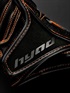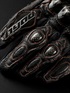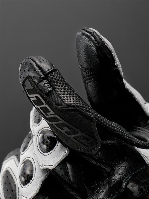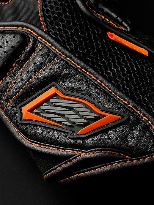 HYODレーシンググローブのノウハウをストリートユースに進化させたパターンを採用しています。指には、指の曲がりを妨げないフローティングタイプのレザーパッチ、さらに中指と薬指にはカーボンプロテクターを取り付けています。