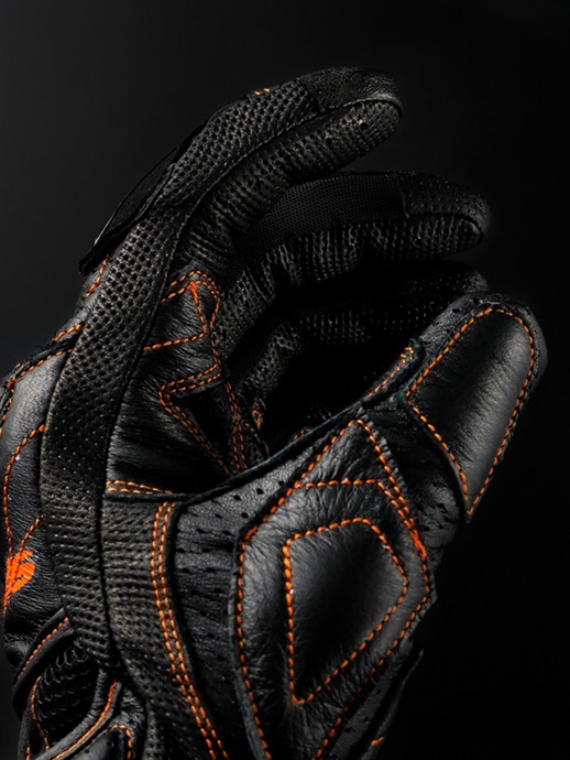 手の甲側には、強度と耐久性にすぐれたカウレザー(牛革)を採用しています。また、転倒時のダメージが小さい個所にはストレッチ性のあるテキスタイル生地を部分使いして、快適さと操作性を向上させています。