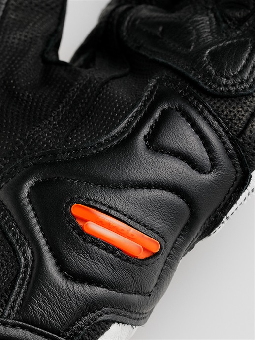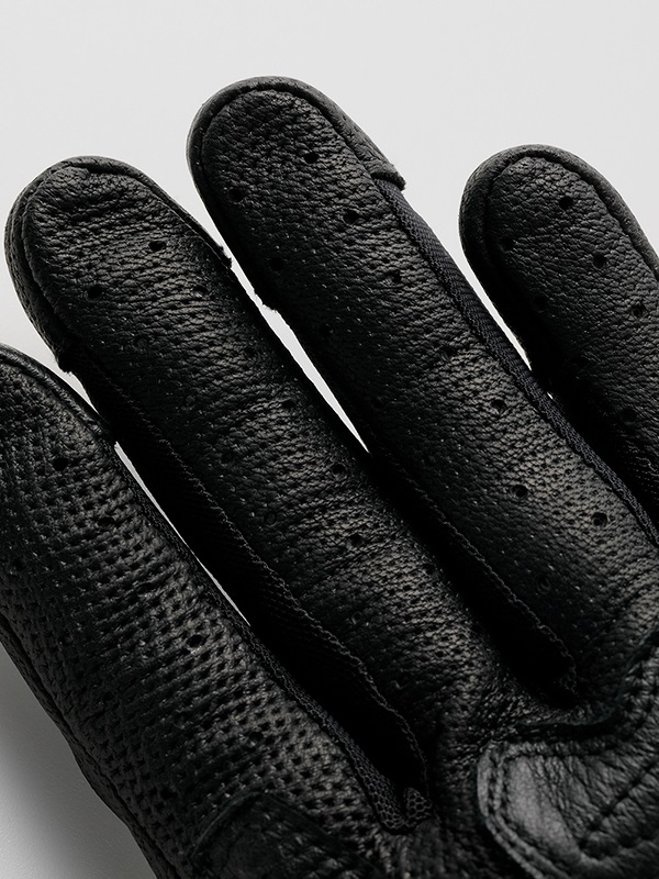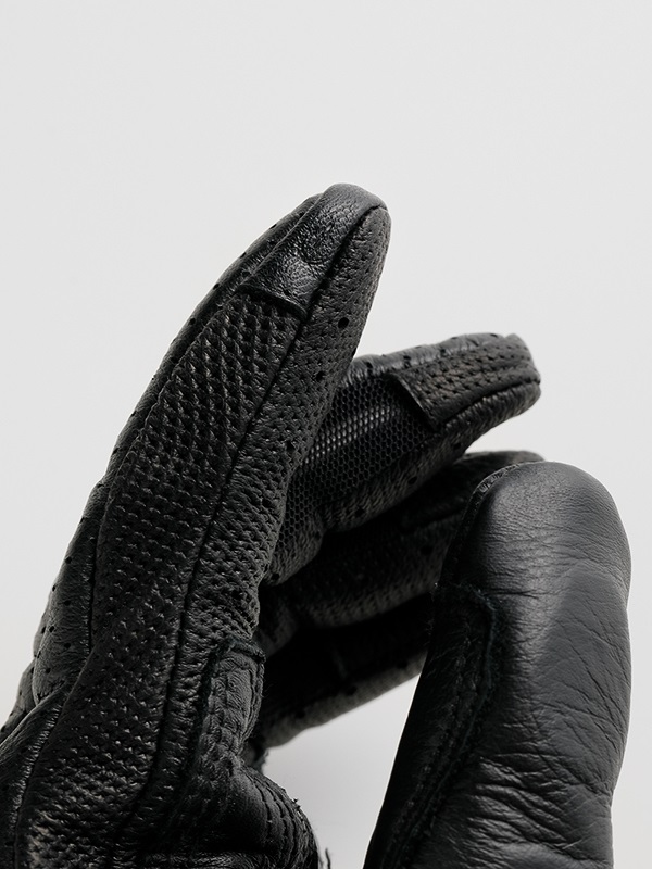 手の甲側には、強度と耐久性にすぐれたパンチング加工を施したカウレザー(牛革)を採用しています。また、転倒時のダメージが小さい個所にはストレッチ性のあるテキスタイル生地を部分使いして、快適さと操作性を向上させています。