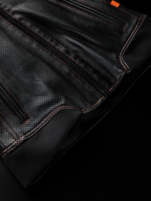切り替えのデザインバランスと、さりげなく配置されたHYODロゴの佇まいが、上質さを際立たせる“ARMET D3O®”。 手首・裾廻りをやさしく包み込むコンフォート性を高めるリブ使いが手首・裾口周りの違和感を大幅に軽減し、心地よいフィット感に加え、開放感を感じられるのも大きな特徴です。ベンテッド仕様のカウライトレザーの着心地も非常にソフトで、フルレザーのウエアとは思えないほどの快適さを実現。プロテクターには超衝撃吸収材D3O®プロテクションの中でも薄く柔らかなエアースルー構造の D3O® Diablo™(CE規格レベル1)を装備。袖内側のスナップボタンでEVOKEシリーズのインサレーションウエアとの連結が可能で、幅広いシーズンで着用いただけます。コンパクトに畳めるEVOKEシリーズのインサレーションウエアは本体腰部の内側に備わるポケットに収納も可能です。
