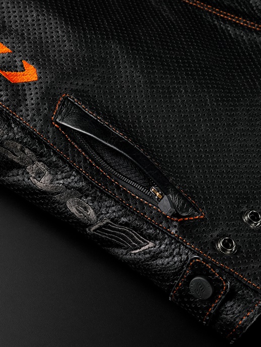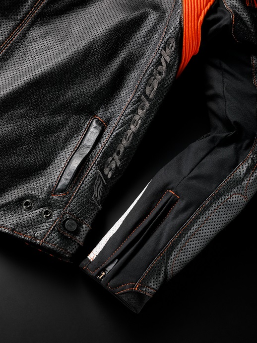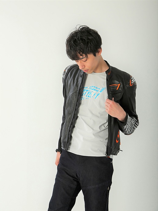 レザーに軽く柔らかくしなやかさが特徴のカウライトレザーを採用。風を受ける前身頃を中心にマシンパンチングを施し通気性を考慮。裏地の吸汗・速乾性に優れたHYODロゴ入りのエアーメッシュがジャケット内の汗によるベタつきを抑えます。