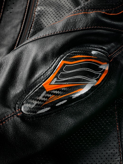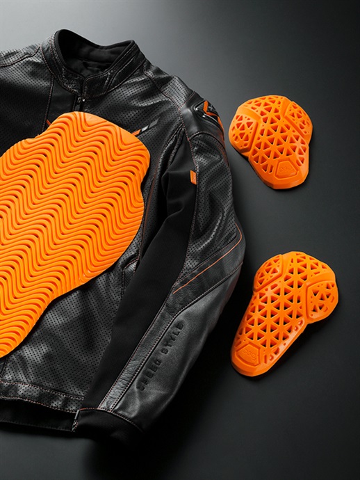 フラッシュドサーフェイスしたカーボンプロテクターとD3O®インサートのハードプロテクターのダブル・プロテクションシステムを採用しています(ダイナミックプロ・レーシングスーツと同仕様)。内側に装備しているD3O®ハードプロテクターは欧州の厳しい安全基準「CE規格」をクリアしています。