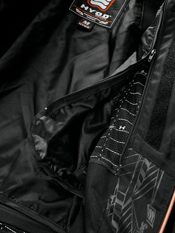 ジャケットの内側にHYOD D3O®チェストプロテクターを装着するアタッチメント(面ファスナー)を装備しています。ワンピースタイプのチェストプロテクターは2カ所で、ツーピースモデルは左右それぞれ1カ所で固定することができます。