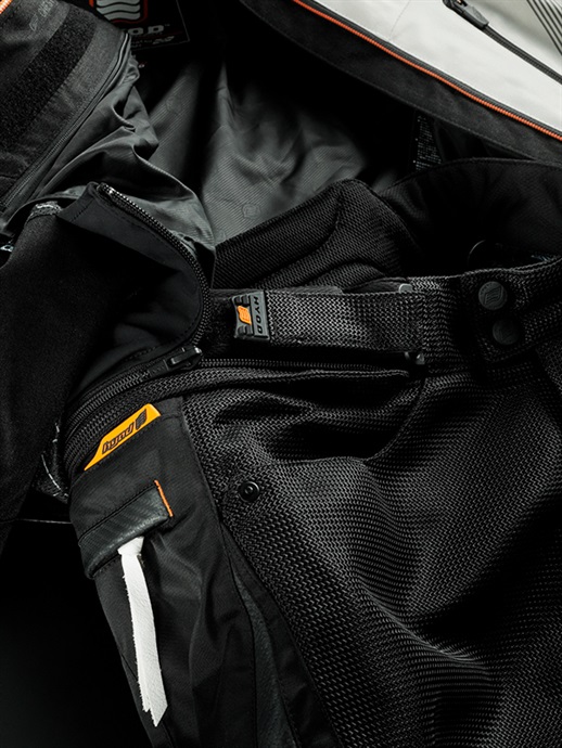 ジャケットとパンツをファスナーでジョイントするスポーツスーツシステムを装備しています。連結するファスナーの長さを共通にし、ジャケットとパンツが異なるサイズでもジョイントすることができます。ジャケットのめくれあがりを防ぎ、転倒時の安全性を高める効果があります。
